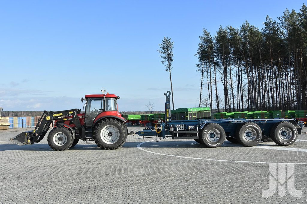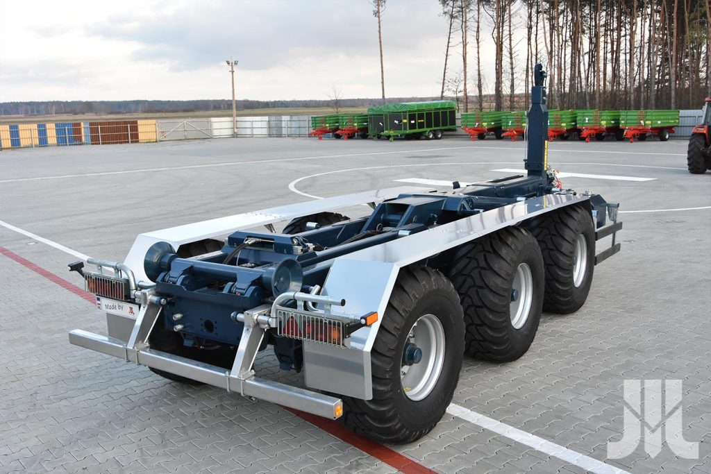Der untere Rahmen ist aus den widerstandsfähigen Stahlprofilen hergestellt, die zusätzlich mit den Flacheisen verstärkt werden und die Dauerhaftigkeit und Steifigkeit der Konstruktion garantieren. Das mit den Stahlfedern gefederte Tridemfahrwerk besitzt 3 Fahrachsen (die erste und dritte sind aktiv gelenkt). Der Ladesystem besteht aus den drei miteinander arbeitenden Rahmen. Ähnlich wie der untere Rahmen sind auch die Rahmen des Ladesystems hergestellt – aus den Stahlprofilen. Im Gegensatz zu den früheren Konstruktionen der Ladesysteme, die in den PRONAR Anhängern verwendet werden, ist der Hakenrahmen mit der Hilfe vom Hydraulikzylider klappbar. Solche Lösung gibt die Möglichkeit der variablen Einstellung der Schwerkraft des transportierten Containers, was die Erhöhung und Verringerung der Belastung auf den Hinterrädern des Schleppers verursacht.