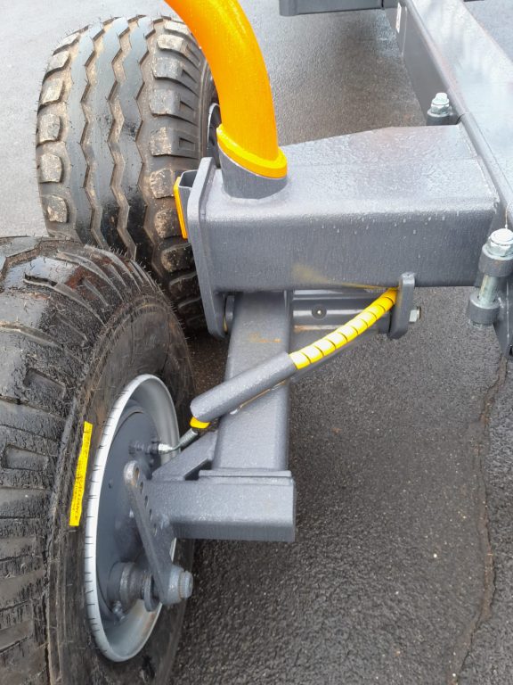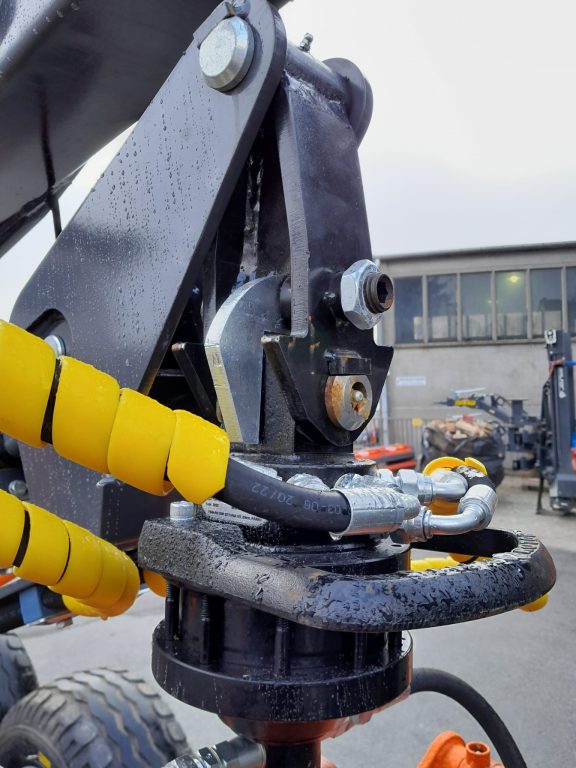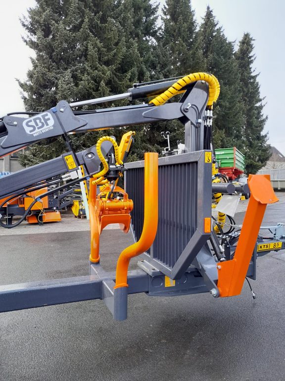 Dieser Anhänger kann für den landwirtschaftlichen Bedarf und kleine intensive Arbeiten verwendet werden. Er hat eine Tragfähigkeit von 8,5 Tonnen. Der Standardanhänger ist ausgestattet mit 400/60 – 15,5 Straßenbereifung, hat 3 Rungenpaare, 1-Zylinder-Lenkdeichsel und einen Zentralrohrrahmen. Der KTS 6.4m ist ein mittelgroßer Rückekran mit einem Hubmoment von 35 kNm. Der Kran hat einen Teleskopausschub, so dass seine Reichweite 6,4 Meter beträgt. Er ist stark und zuverlässig für den langen Gebrauch. Standardmäßig mit einem 3-Tonnen-Rotator und einem KG 180 Greifer (Öffnungsweite ca. 1100mm) ausgestattet, hydraulische Klappstützen (Flap-Down-Abstützung) abnehmbar für die Dreipunktanhängung)
