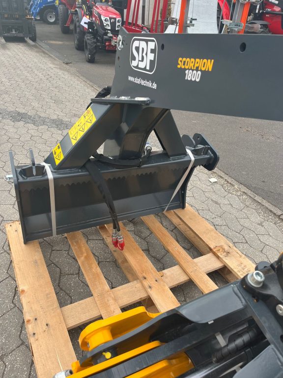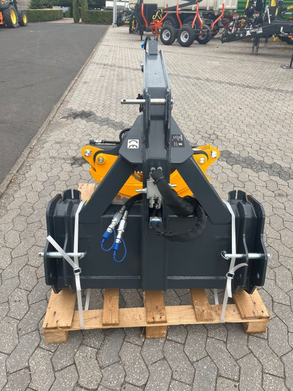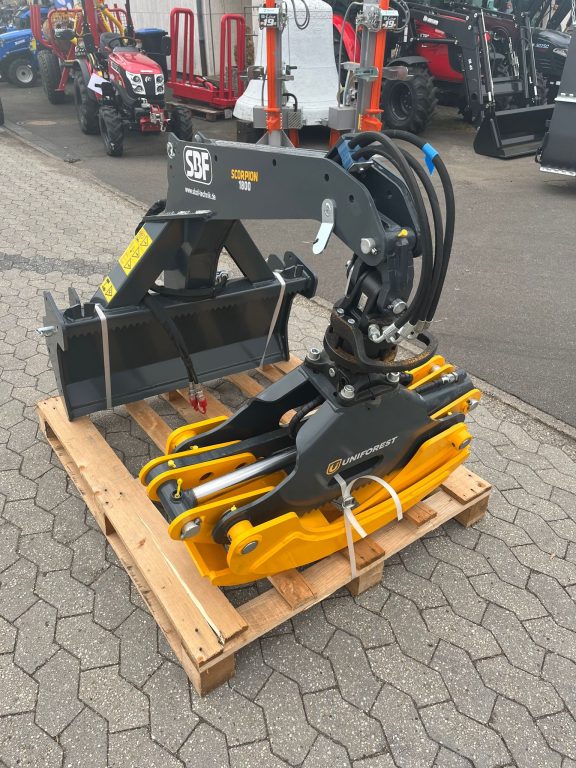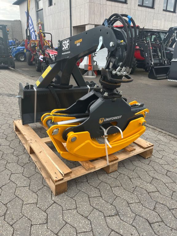 Die Rückezange SCORPION 1800S mit Umschaltventil verfügt über einen fixen Rahmen mit Schutzbrett und kann am Traktor hinten angebracht werden.